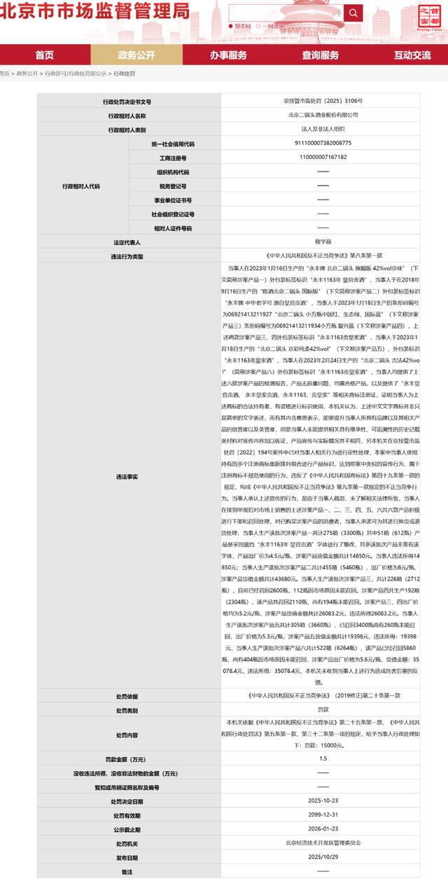 日前,北京市市场监督管理局网站显示,北京二锅头酒业股份有限公司(北京二锅头)因违反不正当竞争法被北京经济技术开发区管理委员会罚款1.5万元。